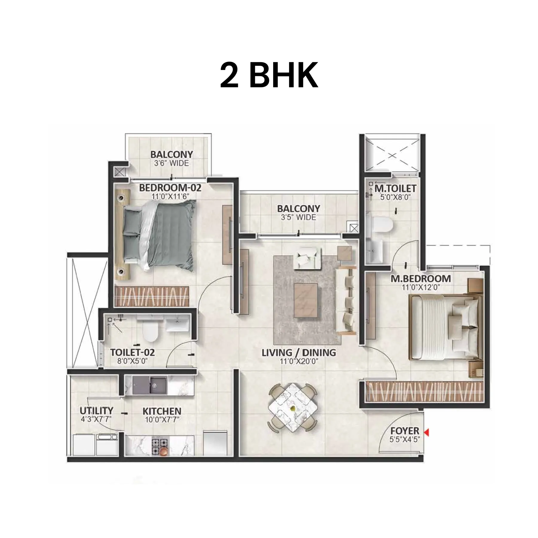• 2 BHK: ~1200 sq ft