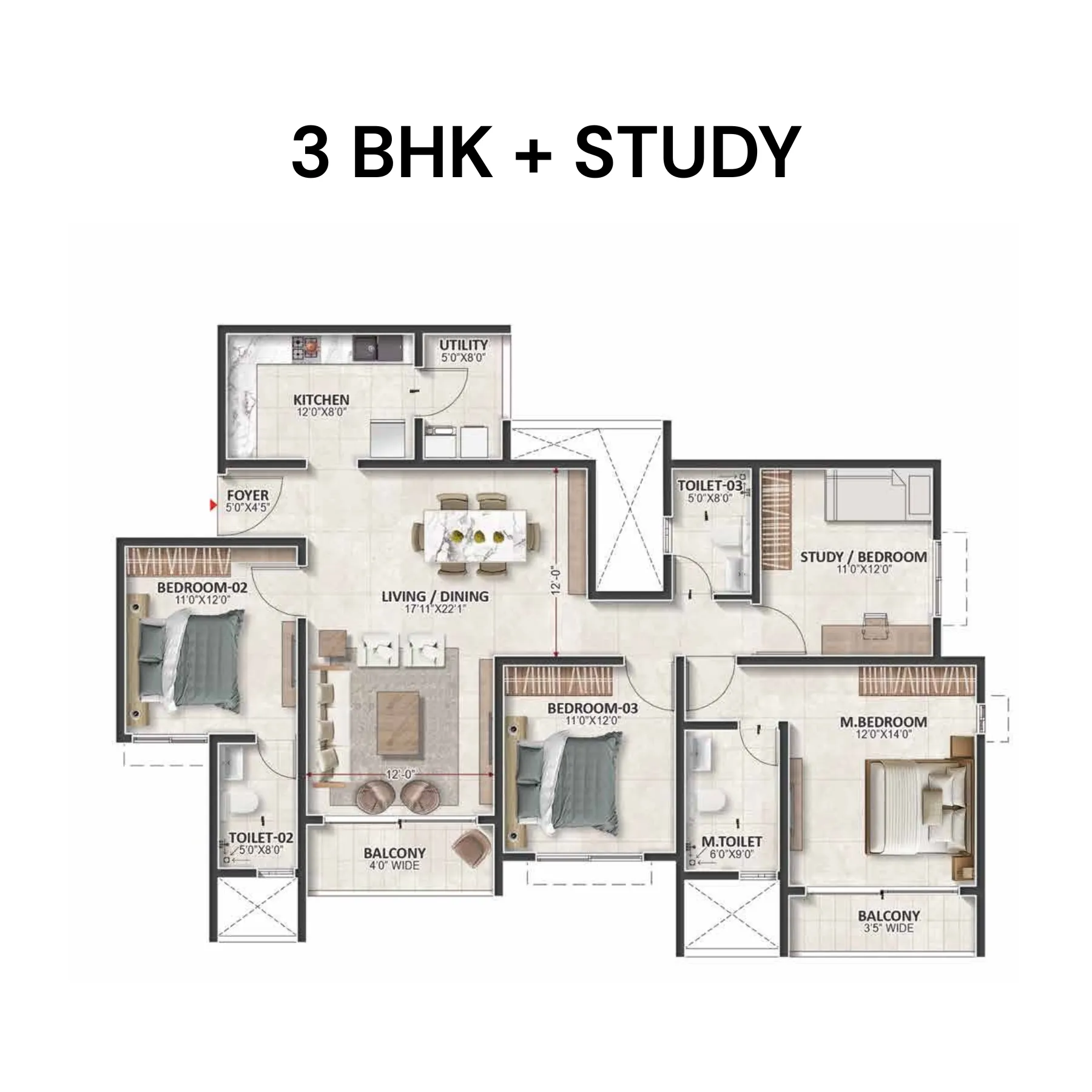 • 3 BHK + Study: 2000–2050 sq ft